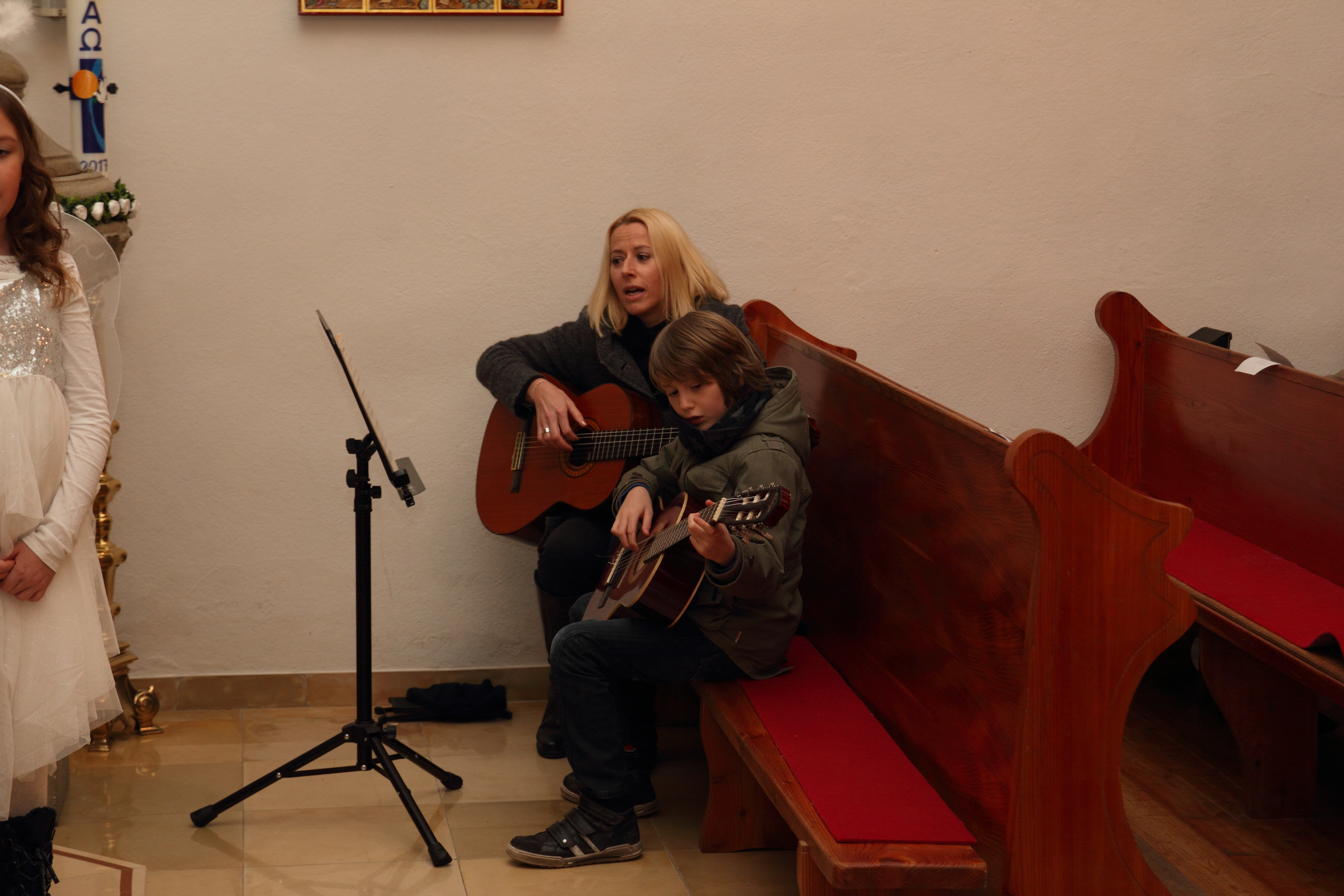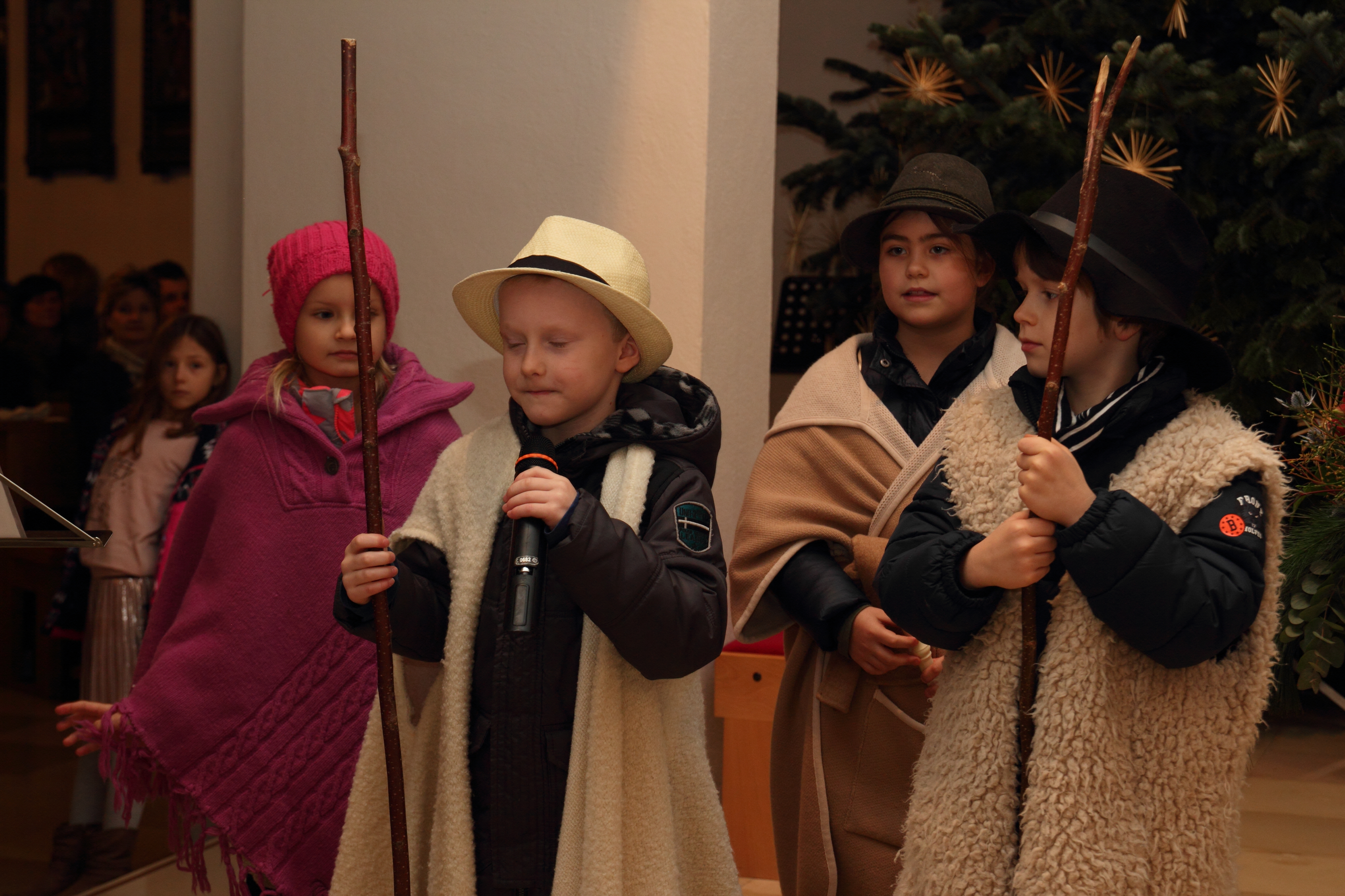 Danach wurde es besinnlich. Die Erstkommunionkinder präsentierten ihr Krippenspiel, das Manuela Laszlo mit ihnen in liebevoller Probenarbeit einstudiert hatte. Sogar ein Instrumentalstück von Mavie wurde eingebaut, und als dann am Ende des Stückes Moritz "Ihr Kinderlein kommet" auf der Gitarre anstimmte, sang die ganze Kirchengemeinde mit! Unterstützung bekam Moritz nun auch von Stefan , Sylvia und Judith.